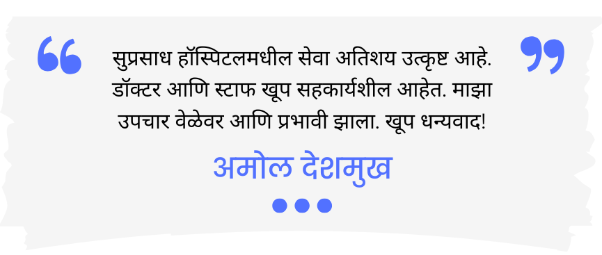 सुप्रसाध मल्टीस्पेशालिटी हॉस्पिटल तुमच्या आरोग्याची संपूर्ण काळजी घेतो! अत्याधुनिक सुविधा, अनुभवी डॉक्टर्स, आणि उत्कृष्ट वैद्यकीय सेवा येथे उपलब्ध आहेत. आमच्या अनुभवी तज्ज्ञ डॉक्टरांच्या मदतीने आम्ही सर्व प्रकारच्या आजारांवर उपचार देतो.